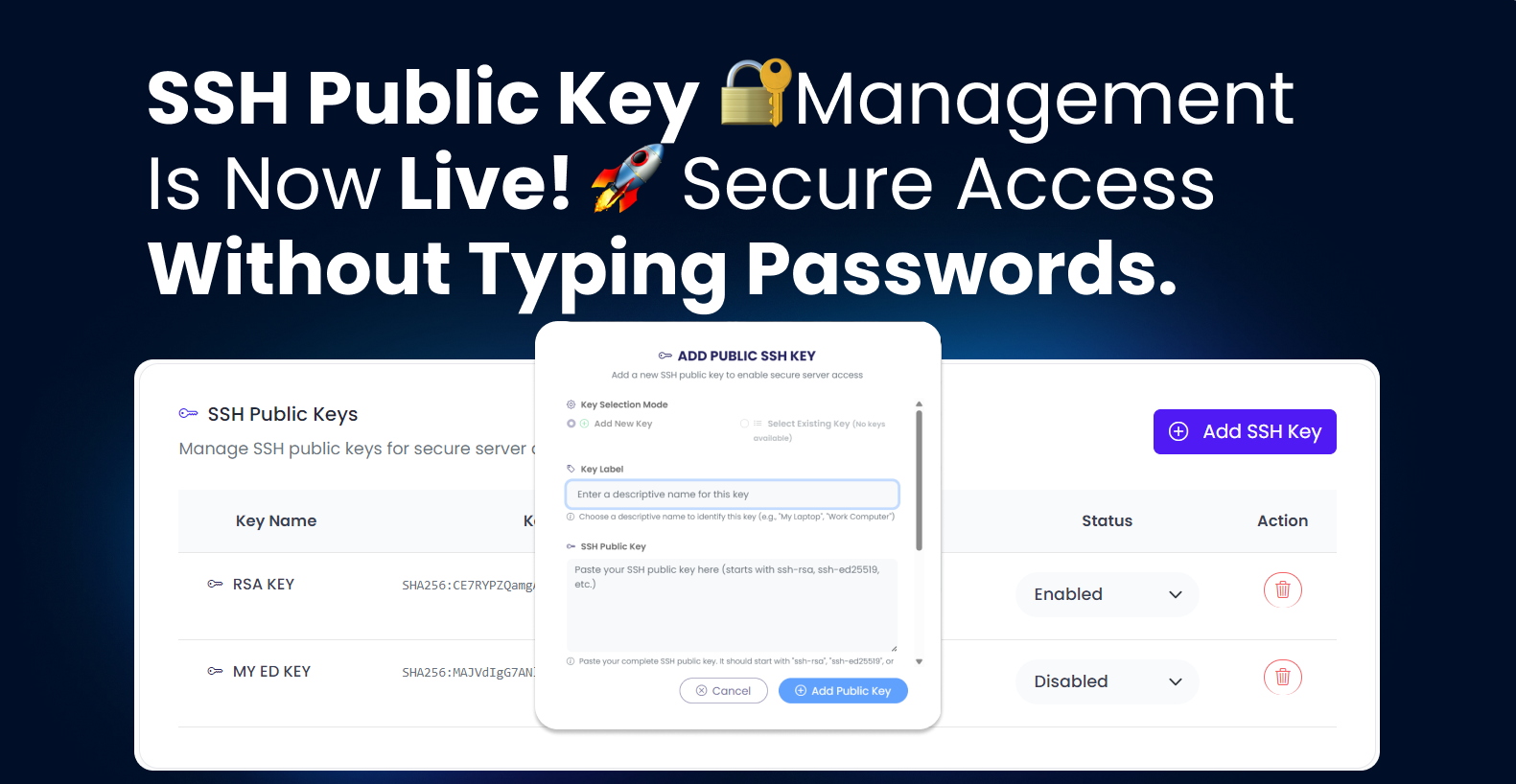 Under the hood, we’re following standard SSH protocol conventions. Your public keys are stored securely on your server’s authorized_keys file, exactly where they should be. We support RSA, Ed25519, and other modern key types. The minimum recommended key length is 2048 bits, though we’d suggest going with 4096 for RSA or just using Ed25519 because it’s faster and arguably more secure.
